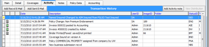 The Activity tab displays the transaction history for the selected record. You can add an e-mail message that you have sent or received or you can edit an existing activity note entries.