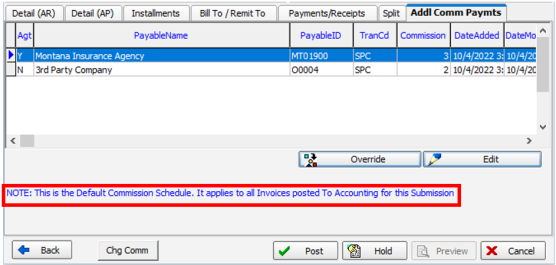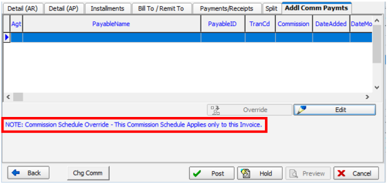 - Once the commission schedule has been altered, the note is changed to indicate that the commission override is in effect for this invoice. Click Edit to change the selected commission schedule using Commission Override/Split.