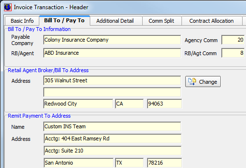 The Bill To/Pay To tab displays information regarding the entity to whom the invoice is billed. With the exception of the Retail Agent Broker/Bill To Address pane, the information displayed on this tab is read-only, that is, you cannot change the information presented here.