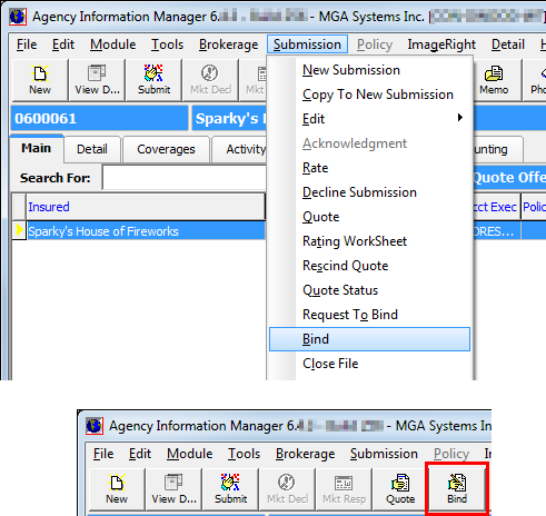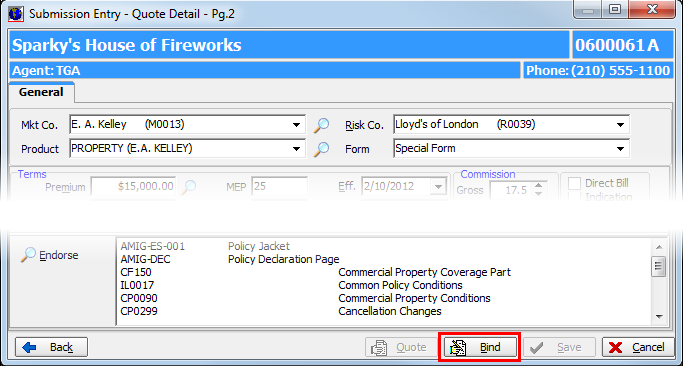 The Bind menu command is used to bind a quote and provide a confirmation of coverage to the retail agent/broker.
