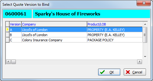 - If there are multiple versions of the quote, and if version A was selected on the Versions tab, then the Select Quote Version to Bind dialog box will appear. Select a quote version to bind and click OK.