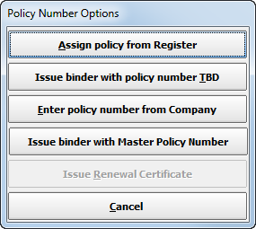 - Issue binder with policy number TBD – issue the binder with the policy number to be determined (TBD) at a later time