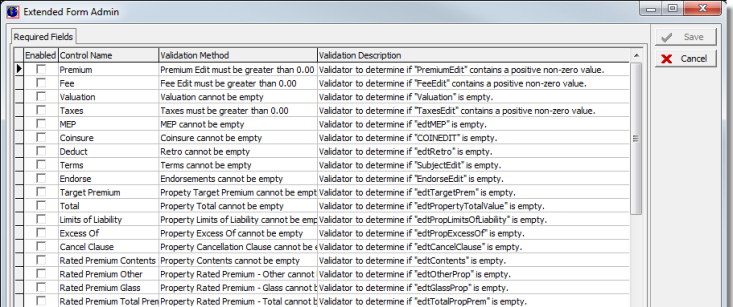 - In the Extended Form Admin dialog box, select the fields to set as required fields, and then click Save.
