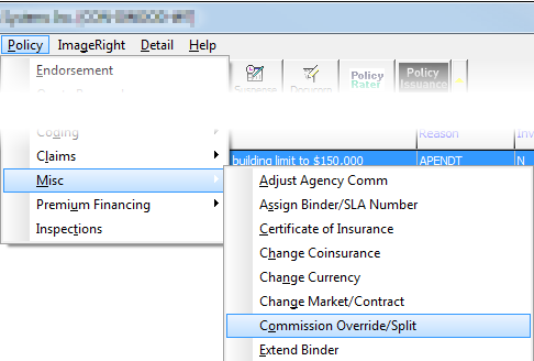 - On the Policy menu, point to Misc, and then click Commission Override/Split.
