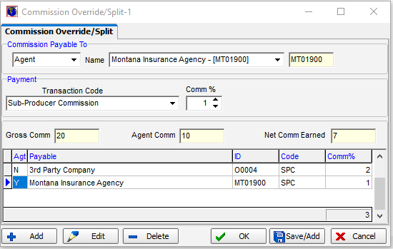 The Commission Override/Split command can be used to add a commission split to edit or delete any commission overrides or splits that exist on a selected policy. These entries will create payables in accounting for the entities included in the split.