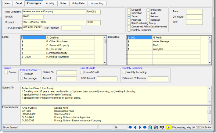 On the Coverages tab, you can view detailed quote/coverage information for the selected quote or policy. Information presented on this tab is intended to provide an overview of the coverages for the selected record. The data is shown in a read-only format, that is, you can view the information but you cannot make changes to the information using the Coverages tab.