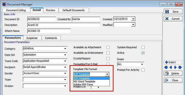 A new field has been added to the Parameters pane of the Document Manager window. The Template File Format list replaces the MSWord Template check box. Choose from: