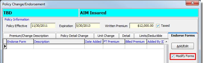 - Click Add/Edit to make changes to the selected endorsement form.