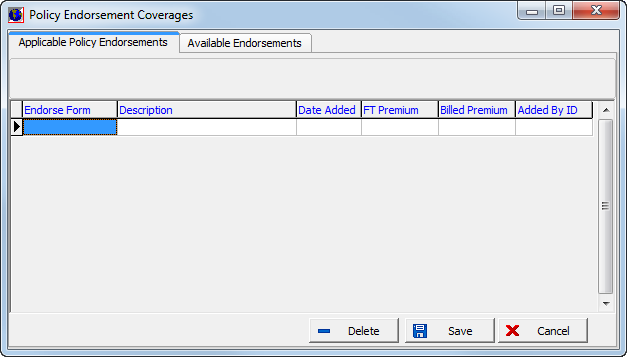 - On the Applicable Policy Endorsements tab, click Delete to remove applicable endorsement forms if necessary.