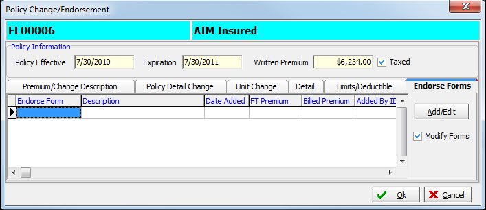 You can use the Endorse Forms tab to add, edit, or delete coverage forms from the policy.