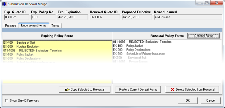 - Press Ctrl and select the forms in the Expiring Policy Forms pane, and then click Copy Selected to Renewal to move the forms to the Renewal Policy Forms pane.
