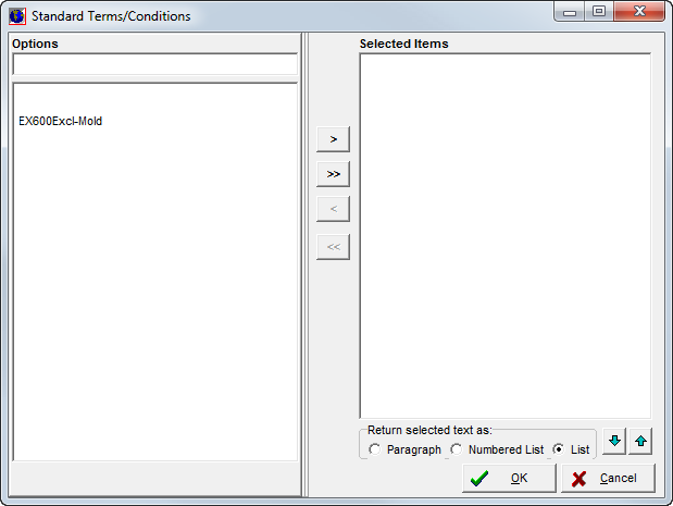 - Select the required forms in the pane on the left side of the Standard Terms/Conditions dialog box, and use the arrow buttons to move the form as described in Terms/Conditions.