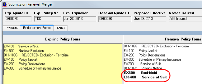 The Endorsement Forms tab displays the differences between endorsements from the expiring policy period and the current defaults.