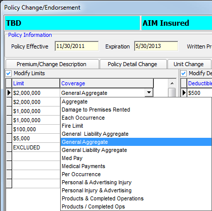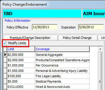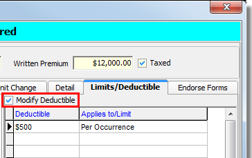 When creating an endorsement, you can use the Limits/Deductible tab to make changes to the policy limits and deductibles and update the view on the Coverages tab.