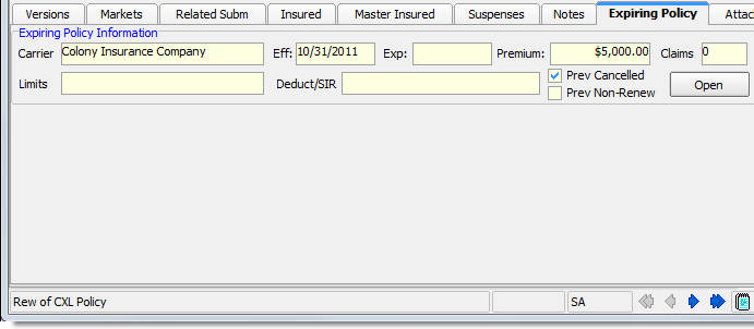 The Expiring Policy tab, located on the Main tab, displays expiring policy information associated with the selected record.