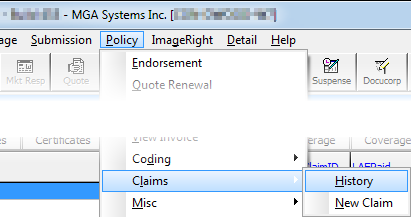 The History command opens the Claims tab located on the Policy Data tab. Using this tab, you can review the claims history for a policy.