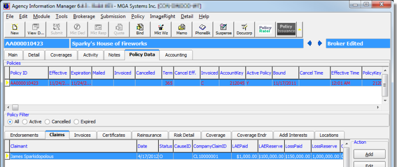 - On the Policy Data tab, you can review claims on the selected policy. Use the buttons described in the table below to manage the claims.