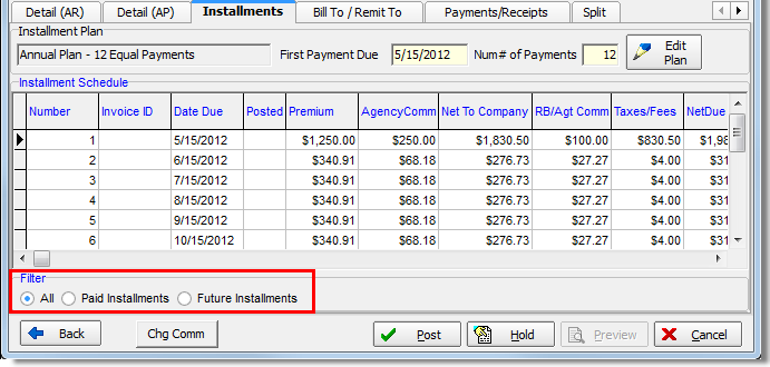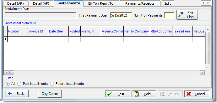 Details of the selected installment plan appear in the grid only after you have edited the selected installment plan, as we discuss in the steps that follow.