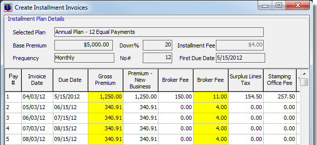 The Installment Plan Details pane located at the top of the Create Installment Invoices dialog box shows information about the selected installment plan in a read-only format. In the grid, you can make changes to the details of the plan. Information shown in the yellow columns cannot be edited, but may change depending on changes that are made to the other columns.