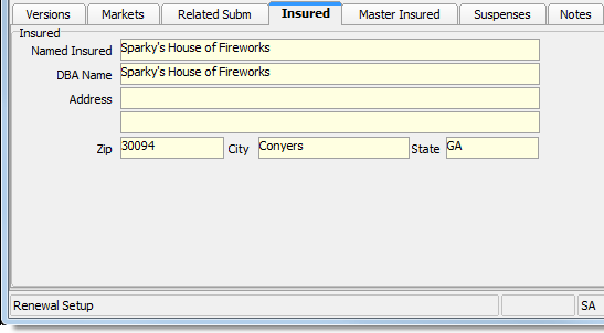 The Insured tab, located on the Main tab, displays basic information about the insured. The information presented is read-only, that is, you cannot edit insured information on the Insured tab. The process to edit insured information is described in Insured.