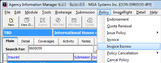 If you have a policy with an escrow account associated with it, the escrow premium must be invoiced separately from the policy premiums and fees. In the steps that follow, we show you how to create an invoice for the escrow premium using the Invoice Escrow command.