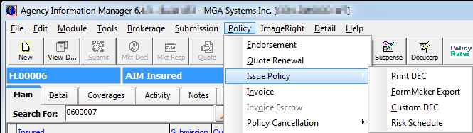 - FormMaker Export – opens the Docucorp application for policy issuance