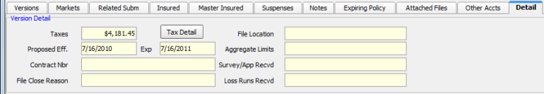 - Click the Tax Detail button to view the tax details of the selected record using Surplus Lines Tax Calculator. The information displayed is read-only, that is, you cannot make changes to the information.