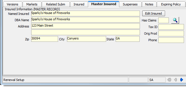 The Master Insured tab, located on the Main tab, displays the master record for the insured. You can edit the insured and view claims records if applicable.