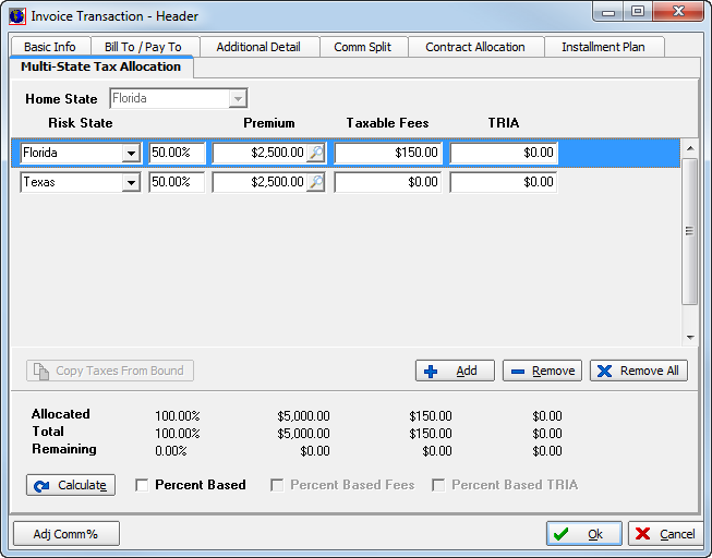 You can use this tab to edit the allocation for a particular invoice for reporting purposes. If the invoice has been exported from the Surplus Lines Stamping Office of Texas (SLSOT) module, then this tab is disabled.