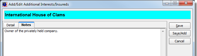 On the Add/Edit Additional Interests/Insureds Notes tab, you can enter text notes specific to the new insured or interest.