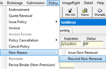 Policy menu, navigate to Non-Renew and click either Issue Non-Renewal or Rescind Non-Renewal.