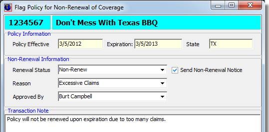 - In the Transaction Note text box, type any notes that are relevant to the non-renewal of the policy.