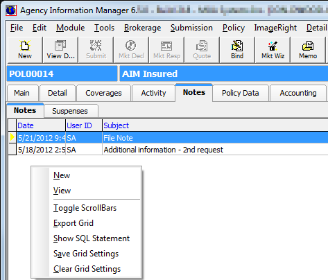You can use the Notes tab to view and add system notes and suspenses on the selected record. You can also add pop-up notes to records. Pop-up notes are similar to sticky notes in the paper world and are displayed when the record is access on the Main tab.