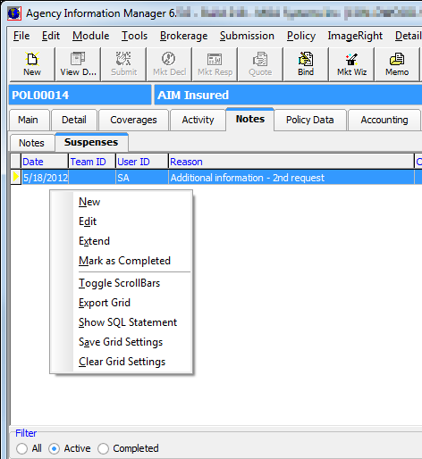 The Suspenses tab displays suspenses associated with the selected record. You can add a new suspense via the menu that is revealed when you right-click the grid using the steps described in Suspense.
