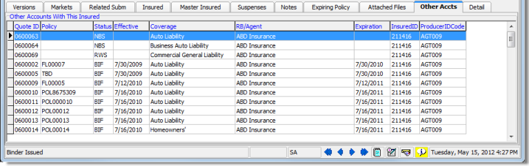 On the Other Accts tab, located on the Main tab, you can view other submissions related to the currently selected record.