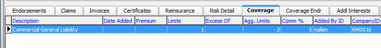 The Coverage tab displays a view of information pertaining to coverages associated with the selected policy. This information is read-only, that is, it cannot be edited.