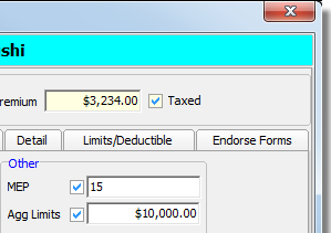 The Policy Detail Change tab is used to make changes to the policy number, policy term, commissions, or the MEP and aggregate limits.