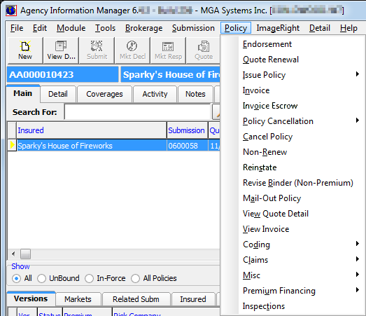 On the Policy menu, you can manage in-force, expired, and cancelled policies, including endorsement, cancellation, and reinstatement notices and inspections.