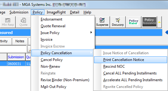 - On the Policy menu, point to Policy Cancellation, and then click Print Cancellation Notice.