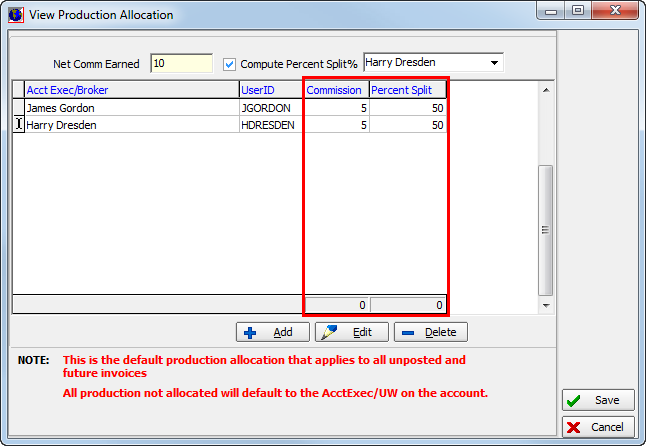 The Production Allocation command is used to view or edit production allocation. Changes made using this command will be reflected in future invoices and invoices that have not been posted only. Any production not allocated will go to the assigned account executive.