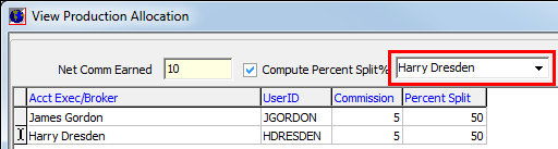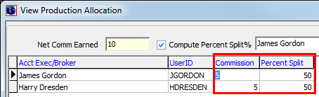 - In the Production Allocation dialog box, the Net Comm Earned box is populated automatically. Select Compute Percent Split% to show the Commission and Percent Split differences in the boxes below the grid.