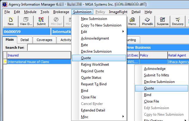 The Quote option is used to create a new or revised quotation/indication. Each time a quote is issued in AIM, it is assigned a version letter, which is displayed on the Versions tab. The first version of a quote is given the version letter A; the second version is given the version letter B, etc. For example, the first time you create a quote you could be assigned the quote number 9900048A. The next version of this quote would be 9900048B.