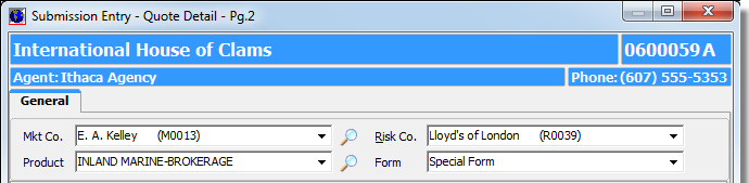A default premium schedule can be created for products in Data Maintenance Utility (DMU). If a default schedule exists, you will be prompted as to whether you want to copy the product defaults to the submission. If you do, the Premium field will not be editable. You can click the magnifying glass button to open the Premium Distribution dialog box. Likewise, the agent and gross commissions can be defaulted using a premium schedule in DMU. In these cases, you can choose whether to override the default commissions with the policy commissions. In such cases, the commissions are not editable in Submission Entry – Quote Detail – Pg. 2. |