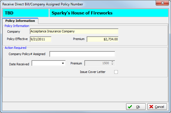 If you have bound a policy without a policy number, that is, you have used To Be Determined (TBD) in place of the policy number, and then you can use the Receive Company/Direct Bill Policy number to assign a policy number to the policy. This process also causes the correct policy number to be entered in the Accounting application for invoices that have already been exported from AIM.