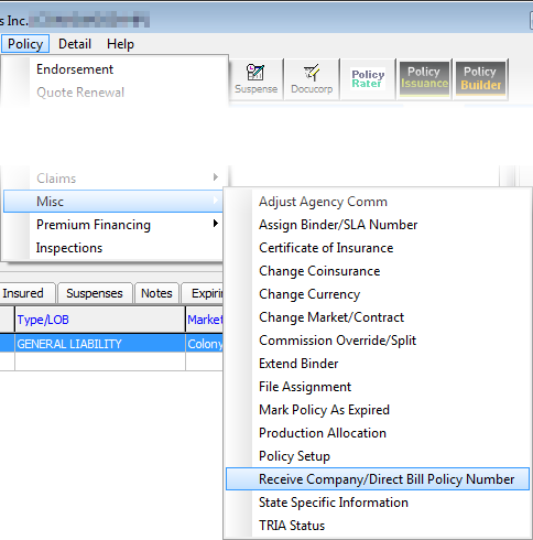 - On the Policy menu, point to Misc, and then click Receive Company/Direct Bill Policy Number.