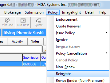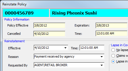 This information is read-only and cannot be edited from the Reinstate Policy dialog box. - In the