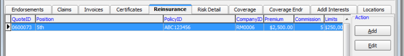 The Reinsurance tab displays all facilitative reinsurance information associated with the selected record. You can also add and edit reinsurance information as needed.