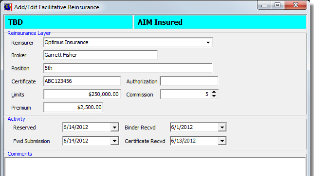 If you require any additional information about entering reinsurance information, please contact AIM Product Support.