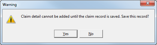 - If the claim record has not been previously saved, the Warning dialog box appears. Click Yes to save the record, or click No to abandon changes to the claim record.