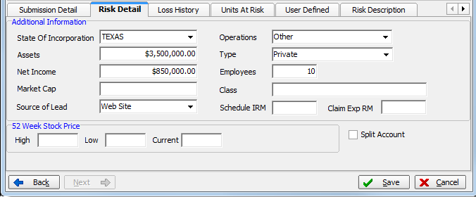 Use the Risk Detail tab to provide additional information about the risk such as assets, income, number of employees, and stock prices for the insured.